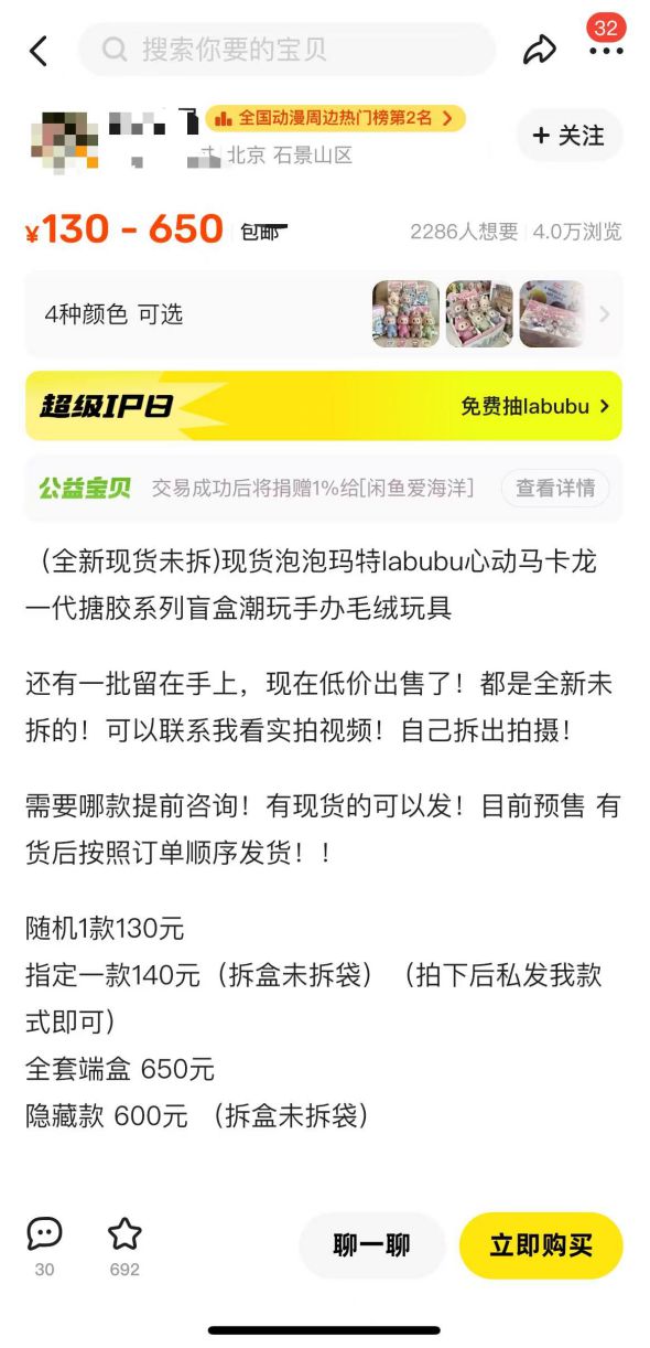 “祖國版的價格也很貴,主要是臉蛋好看,正品實在是太難搶了,今年上半年我只搶到一個一代的Labubu”,一位消費者對《號外工作室》説,自己530元入手了一端(指一次性購買一整套盲盒),便宜的祖國版Labubu不好看,只能咬咬牙買價格偏貴的祖國版Labubu。