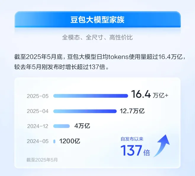 截至2025年5月底,火山引擎tokens日均調用量已經達到16.4萬億,較2024年5月發佈時增長了137倍。