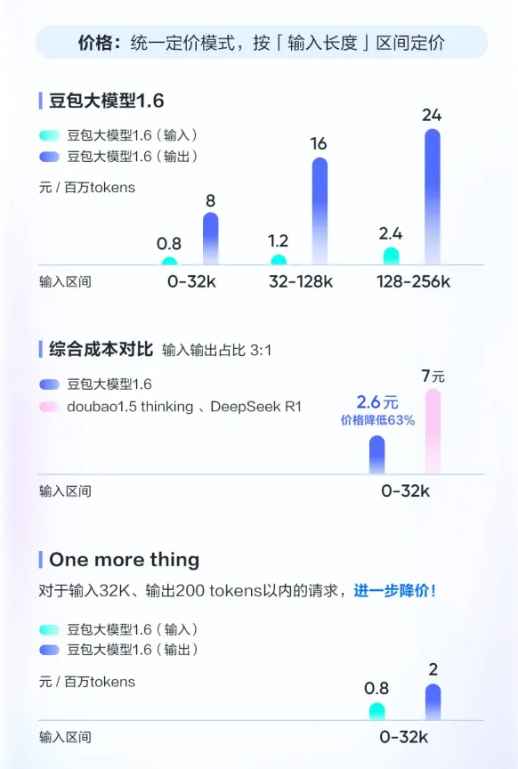 以企業調用量最大的0—32K為例,豆包大模型1.6的輸入價格為0.8元/百萬tokens、輸出價格為8元/百萬tokens,整體成本只有豆包1.5深度思考模型或DeepSeek R1的三分之一,性價比拉滿。