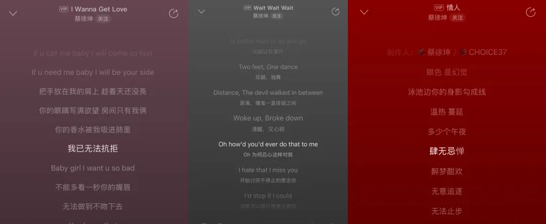 接下來幾年,從《Wait Wait Wait》到《情人》,蔡徐坤逐步確立了屬於自己的“性感敍事美學”。歌詞中對情慾、拉扯、渴望的描寫也更偏隱喻化,不再是初期《I Wanna Get Love》那種直白、小詞的堆砌表達。