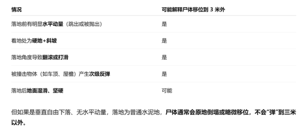 4)家屬和通報都提到,羅某宇墜亡時,頭部首次落地距離牆面4米,經反彈,頭部距離牆面7米。家屬以此質疑不是自殺,我專門問了Chat GPT,墜亡時頭部發生反彈,是有可能的。僅僅根據這一點,並不能完全推翻通報中提到的排除他殺的全部證據。