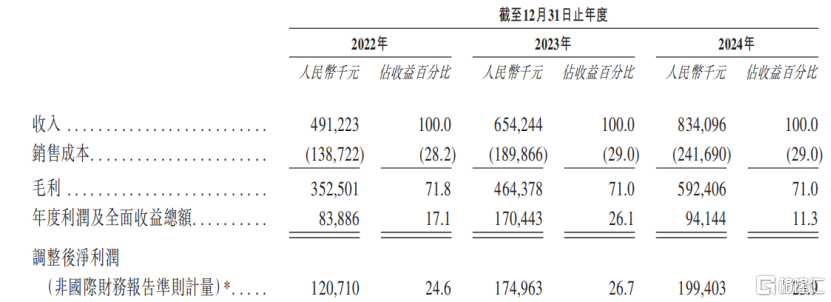 排除按公允價值計入損益的金融負債(授予少數權益股東的優先權相關的無條件義務)的公允價值變動影響,經調整後淨利潤1.21億元、1.75億元、1.99億元。同期毛利率分別為71.8%、71.0%及71.0%。