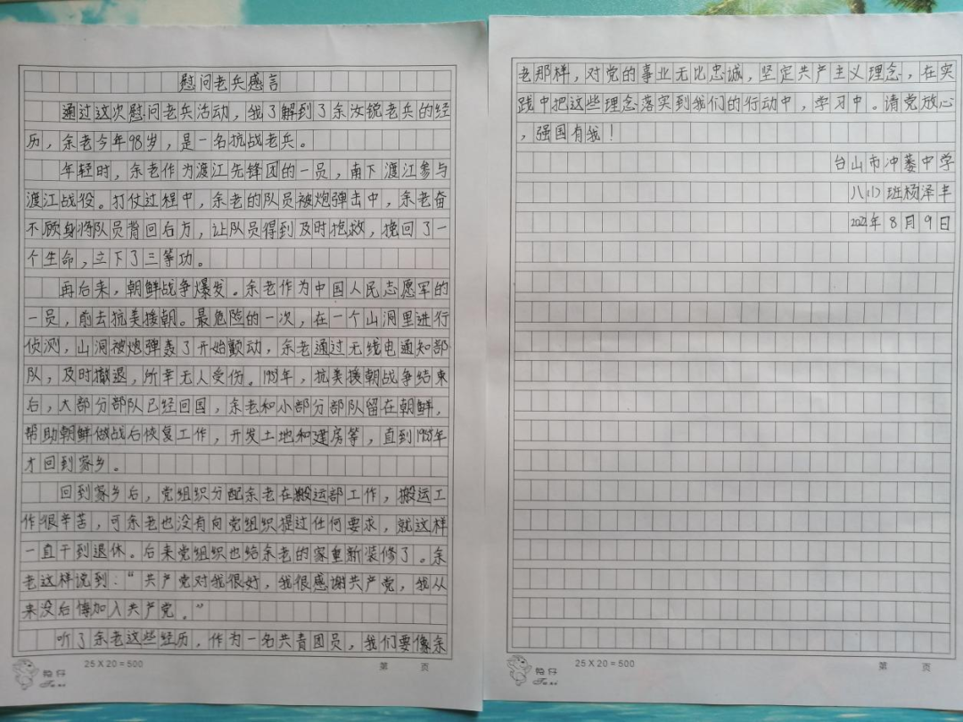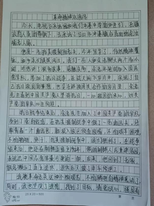 採訪尾聲,餘老激動地對小記者説:“現在的生活好啦,我們以前打仗的時候只有小米和高粱吃,有機會吃上一頓大米是件很幸福的事情,沒有水喝都是去山腳下扛冰塊回來喝。現在我們年紀大了沒用啦,我希望我的子孫後代要好好學習,報效社會。”