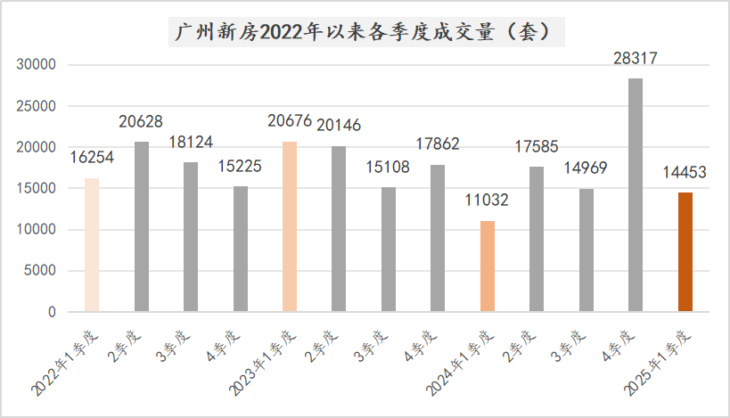今年1季度廣州新房成交14453套,這個數字對比2022年、2023年同期確實低了,但跟過去三年各季度相比不算跌相難看的數字