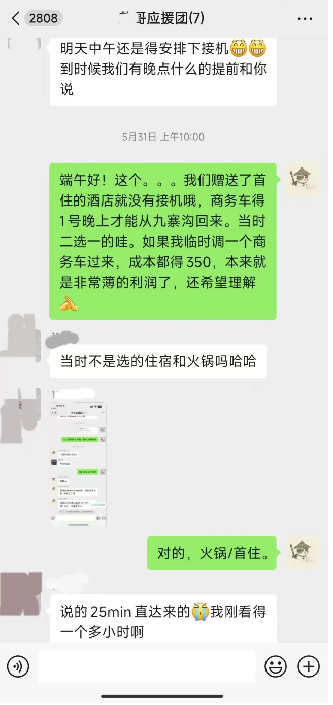 小黃説,“你們首晚贈送的酒店是自己選的呀,我們市區兩台車或者一台商務車過來,單邊 80 公里,來回 160 公里,這個成本在這,真不能免費。”