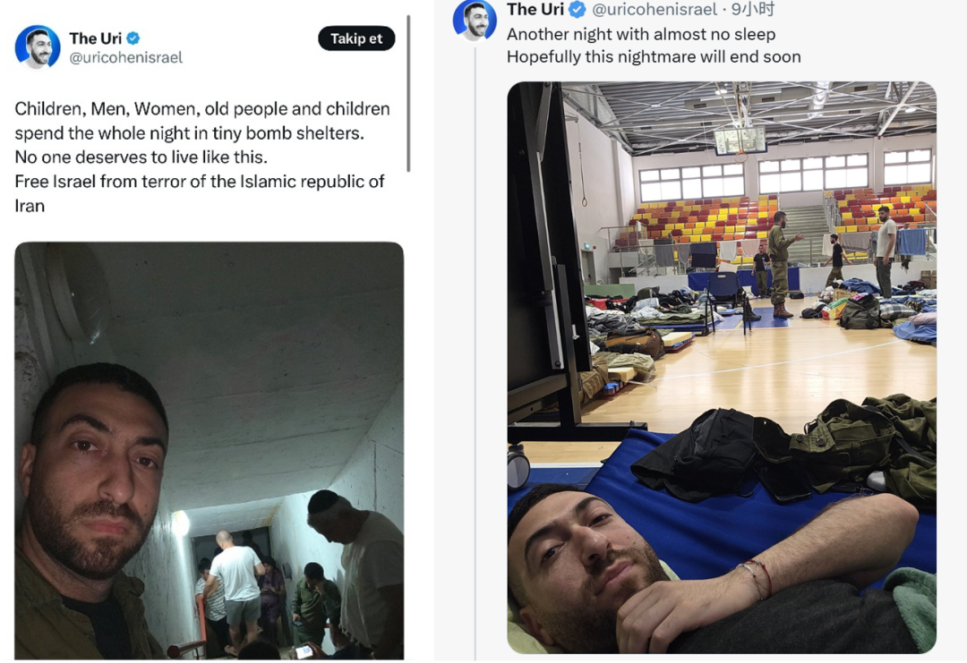 如下面這位叫烏利的以色列預備役士兵第一晚發文稱,“孩子、男人、女人、老人和兒童在狹小的防空洞裏過夜,沒有人應該過這樣的生活,讓以色列擺脱伊朗伊斯蘭共和國的恐怖”。