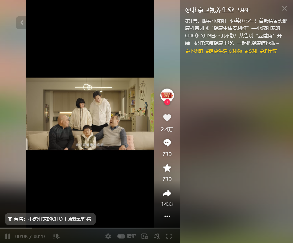 安利紐崔萊首度觸電品牌定製短劇,與北京衞視《養生堂》節目合作,邀請小瀋陽一家拍攝健康科普短劇《“健康生活安利你"之小瀋陽家的CHO》,北京衞視官方視頻矩陣同步上線。
