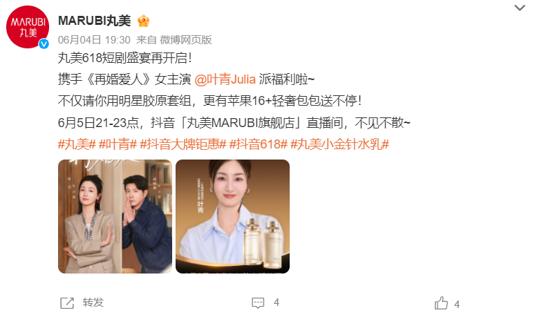 美妝、電商、消費品依舊是最愛定製短劇的品牌。今年丸美踢掉韓束,成為618期間勢頭最猛的美妝品牌,與抖音合作的多部短劇從5月就陸續上線,打響品牌營銷第一槍。