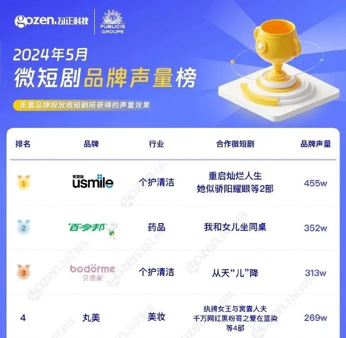 一超,指的是一直以來的大金主——美妝品牌,據勾正科技發佈的5月商業微短劇熱度榜顯示,今年丸美成為品牌定製短劇大頭,投放的《親愛的宿敵》《你好!同窗媽媽》《汪汪的愛不説謊》《下一任,是幸福》主攻女性用户,表現不俗,其中三部播放過億。