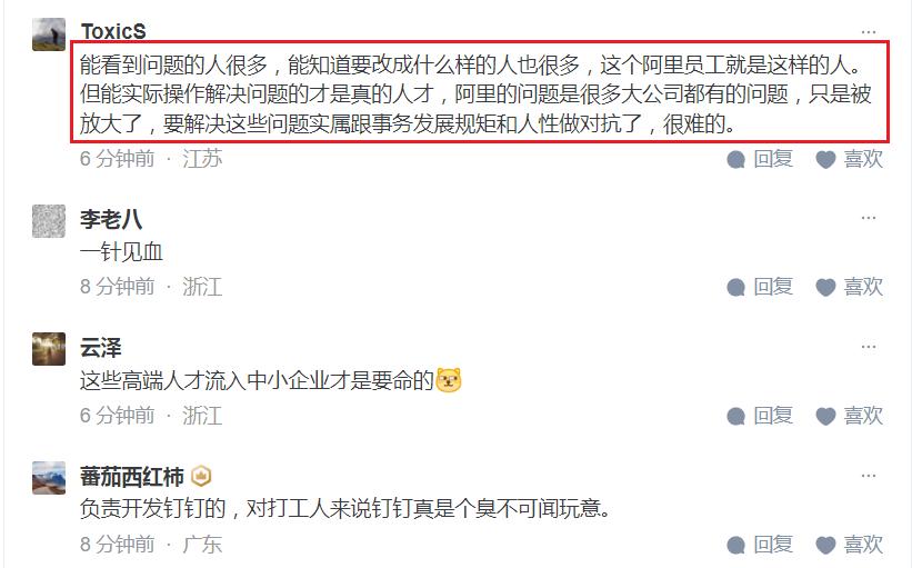 元安離職前擔任釘釘的產研負責人,他在“萬字長文”中直言不諱地指出了自己所看到的阿里目前在人、財、事三個方面的問題,矛頭直指阿里的“大公司病”,該篇長帖被媒體們傳播到外網後也引發了不少打工人的共鳴,頗為戲劇性的一幕是,其中還有前釘釘員工;