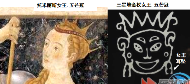 6、三星堆金杖上女王頭上的王冠是“五芒冠”,與上左圖托米麗司女王頭戴“五芒冠”相同——這個五芒冠相同證據很鐵,根據史學考證相同確定性原則:説明這根金權杖的原始主人就是托米麗司女王。