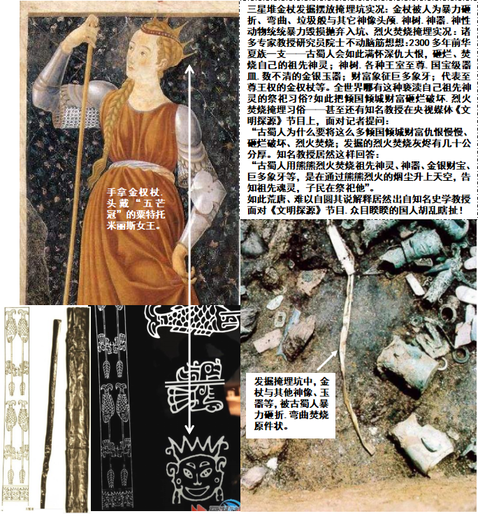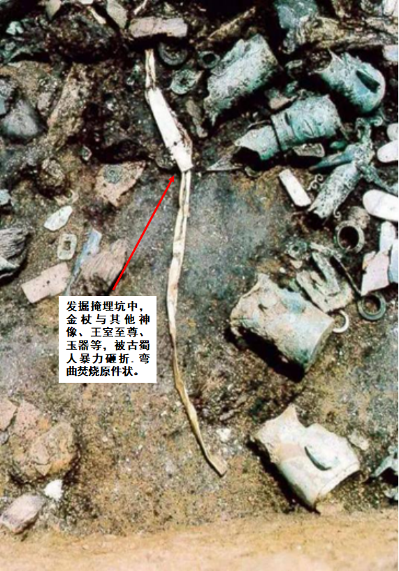 發掘坑現場可見:金杖被人為暴力砸折、彎曲、垃圾般與其它神像頭顱.神樹.神器.神性動物統統暴力毀損拋棄入坑、烈火焚燒掩埋實況:諸多專家教授研究員院士不知是裝着不懂、還是為了定向整成“本土文明”故意掩蓋史實:難道2300多年前華夏族一支(按照諸多專家教授研究員院士説法是3000多兩千的商代文物)——古蜀人會如此滿懷深仇大恨,砸爛、焚燒自己的祖先神靈神樹神獸;各種王室至尊;國寶級器皿;數不清的金銀玉器;財富象徵巨多象牙;代表至尊王權的金權杖等?全世界哪有這種褻瀆、踐踏自己祖先神靈的祭祀習俗?如此把傾國傾城財富砸爛破壞.烈火焚燒掩埋?