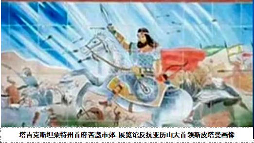 7、另一輔證:苦盞一帶,是拜火教先知鎖羅亞斯德的原鄉。誓死反抗亞歷山大的反抗軍首領斯皮塔曼(有翻譯.斯皮達門)就生活在一帶——至今苦盞市郊還有斯皮塔曼反抗亞歷山大的紀念館(見圖片)。可見**:逃難到三星堆的這撥古波斯雅利安人,其中就有馬薩格泰人托米麗司女王200年後的嫡系後裔(只有嫡系後裔,才會遺傳.擁有祖先托米麗斯女王的金權杖)。由此又從另一個角度佐證:這撥古波斯雅利安人反抗軍,主體部分來自塔吉克斯坦粟特區域錫爾河流域苦盞一帶。這根金權杖的原始主人就是托米麗斯女王。**