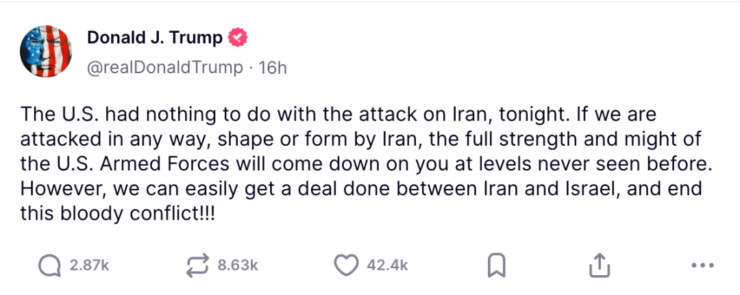 隨後特朗普話風一轉,表示“自己可以很容易地在伊朗和以色列之間達成協議,結束這場血腥的衝突!”特朗普重申,希望通過與伊朗談判阻止核擴散,即便美伊原定在阿曼的會談已被中斷,他仍稱“兩國都願意談判”,且當前衝突反而可能“加速達成協議”。他主張避免長期戰爭,強調伊朗核問題更應依靠外交而非武力解決。