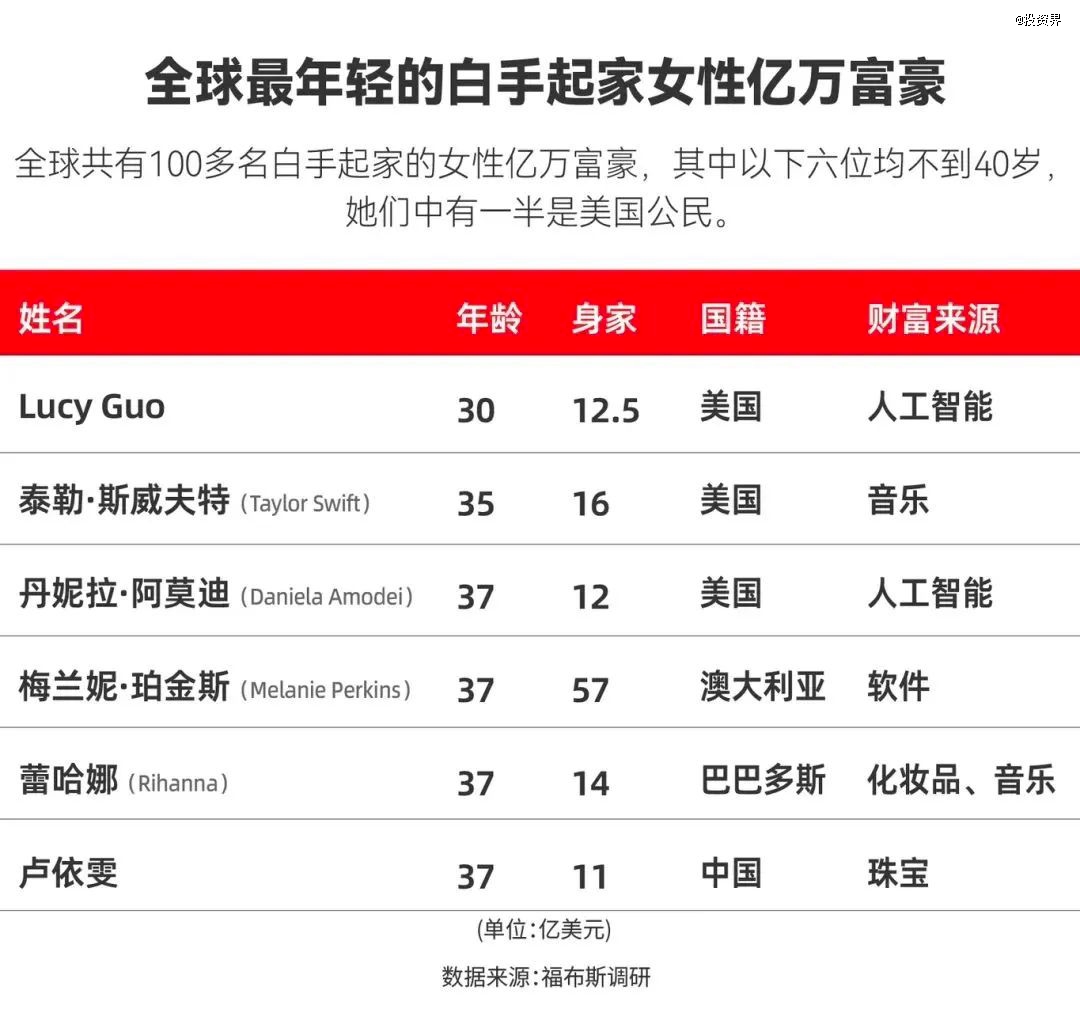 隨着交易落地,剛剛30歲的Lucy Guo再次爆火。這位早已離職的創始人,憑藉持有公司5%的股份,身家暴漲,成為《福布斯》世界上最年輕的白手起家女億萬富豪。