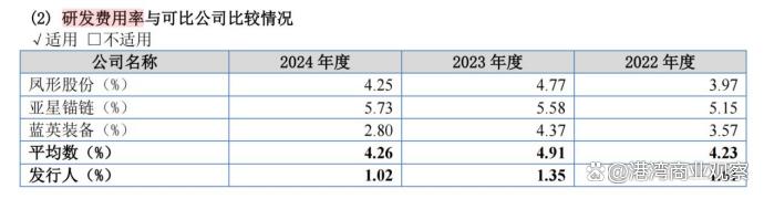 各期,大亞股份的研發費用率分別為1.61%、1.35%、1.02%,同行業可比公司研發費用率的均值分別為4.23%、4.91%、4.26%,差距較為明顯。