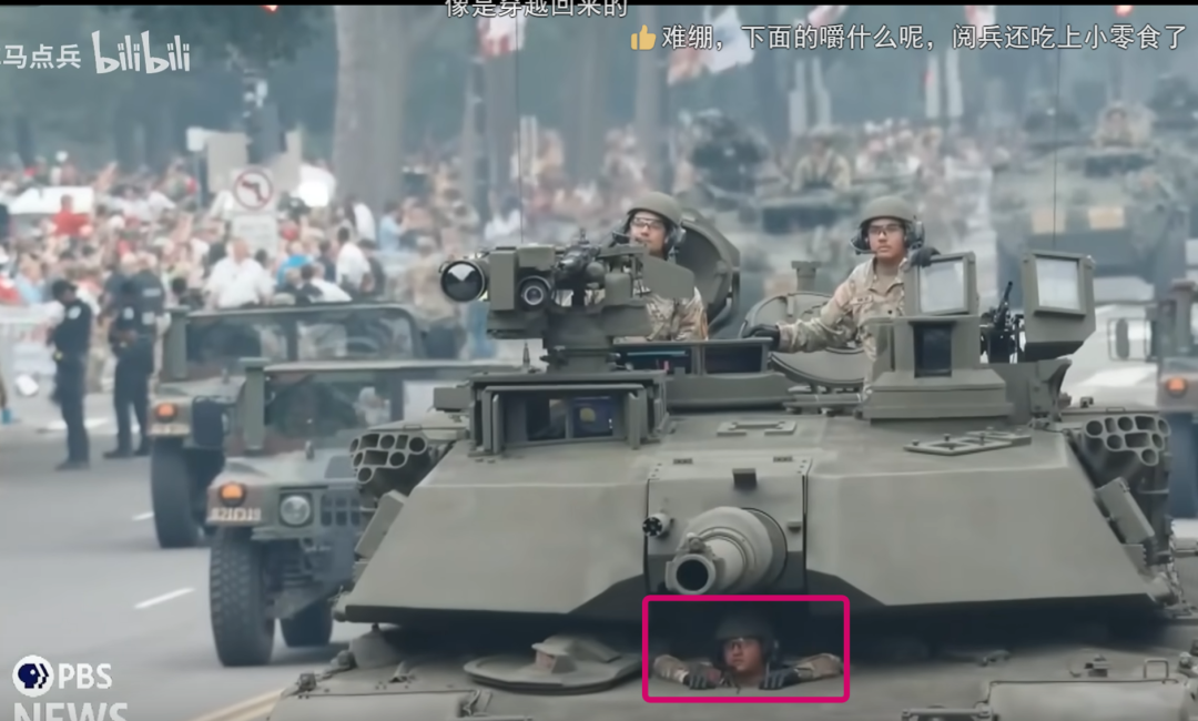 先進的裝備、強盛的軍威一個都沒見到,只看到裝甲方陣中一個坦克兵露出腦袋透氣、大嚼口香糖,像個地鼠一樣。