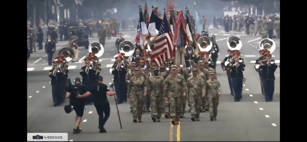 這場閲兵,也設計準備了美軍250年來的各種隊伍方陣,什麼獨立戰爭、一戰、二戰的隊伍,搞得花裏胡哨……但所有人的氣質都一樣,既沒有當年殖民者的兇殘和野蠻,也沒有當代第一軍事大國的霸氣,沒走出虎虎生風,只走出了個恍若隔世。