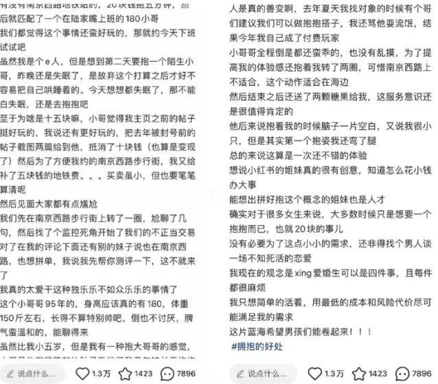 比如在社交媒體上湧現的拼好抱服務,女性只要花個幾塊錢,就能和陌生的理想型男生,找一個無人的角落抱五六分鐘,或者花20元包二十分鐘。