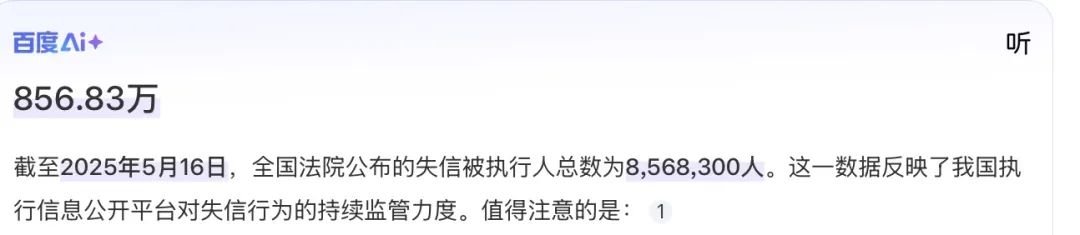 我查了一下數據,2020年全國失信人數是574萬人,到2025年5月底,是856萬人,5年增幅從公佈數字上看,增加了50%。