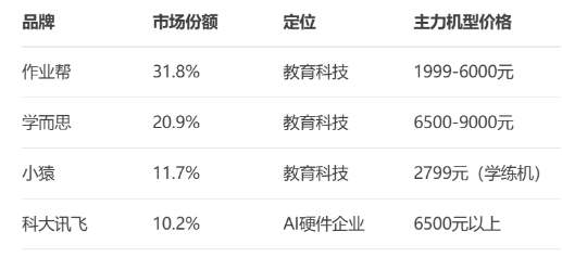 回到市場競爭層面,行業品牌份額格局也佐證了這個觀點,才最終導致學習機行業呈現出教培巨頭>科技巨頭>傳統互聯網教育平台廠商的趨勢。