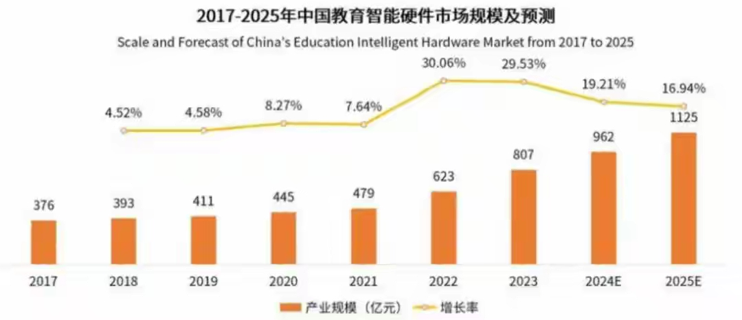 把時間拉長來看,2024年,國內學習機的年銷量接近600萬台,增速25.5%。並且預計今年繼續保持20%以上的增速,銷量將超過700萬台,市場規模將超千億元。據測算,到2025年,我國的教育智能硬件市場規模將超過1000億元人民幣。