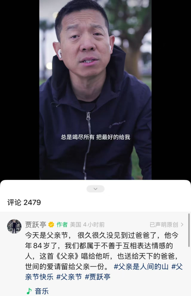 遠在大洋彼岸的賈躍亭今天發表視頻稱:今天是父親節,很久很久沒見到過爸爸了,他今年84歲了,我們都屬於不善於互相表達情感的人,這首《父親》唱給他聽,也送給天下的爸爸,世間的愛請留給父親一份。