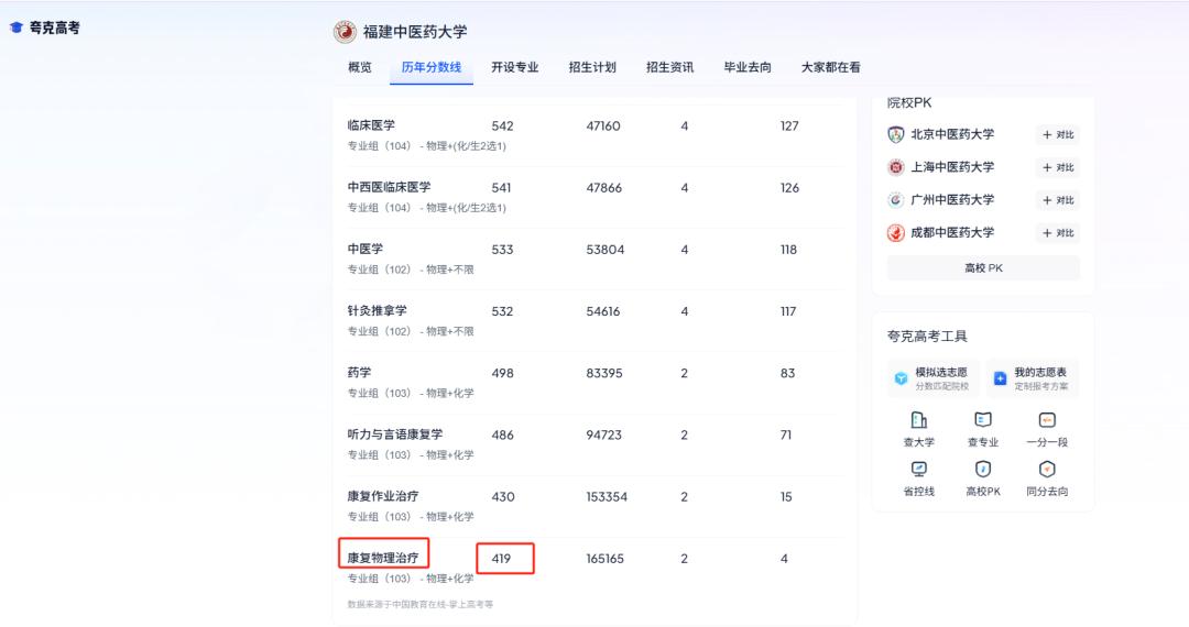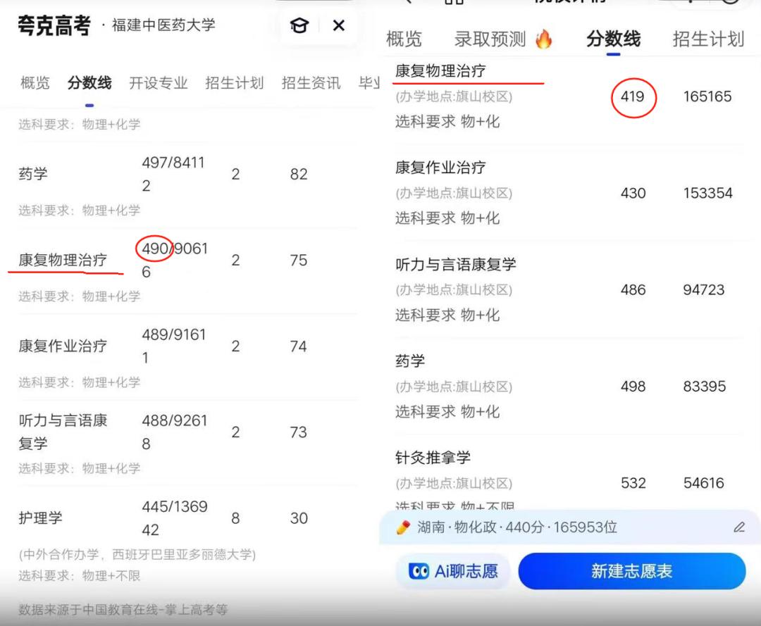 以福建中醫藥大學為例,“康復物理治療”專業在湖南省2023年夸克高考上的分數線為490分,而根據官方數據該項分數為419分。