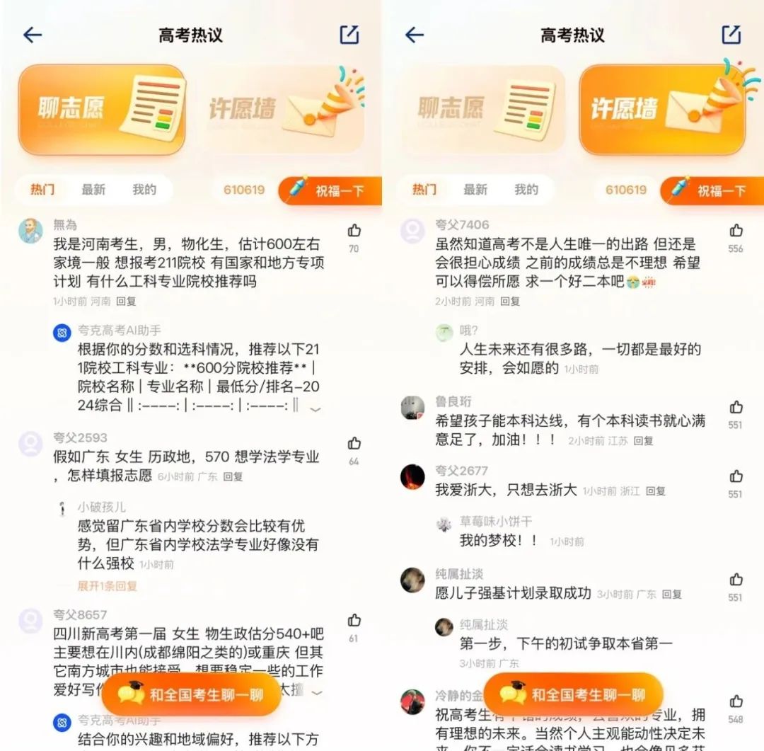 在高考熱議欄還有“聊志願”和“許願牆”兩個功能,最後回覆時間比較近,“1小時前”“2小時前”,可以看出這個功能使用人數還是比較多的。