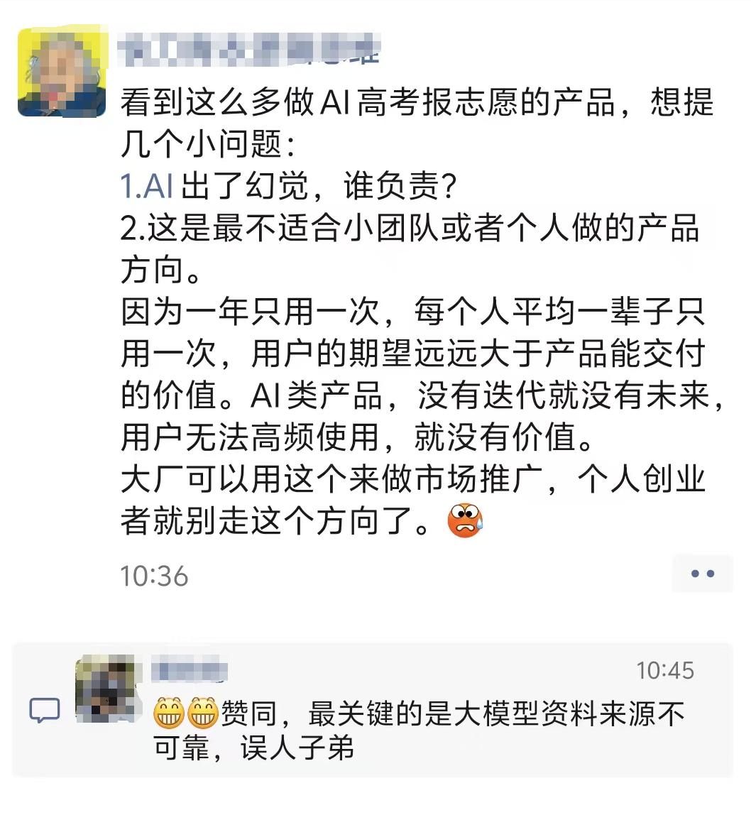 邏輯思維聯合創始人“快刀青衣”就表示,一旦AI高考大模型出現幻覺問題,向考生推薦了錯誤的志願填報信息,導致考生無法被心儀院校錄取甚至滑檔,這個責任誰來承擔?誰來為考生的前途負責?
