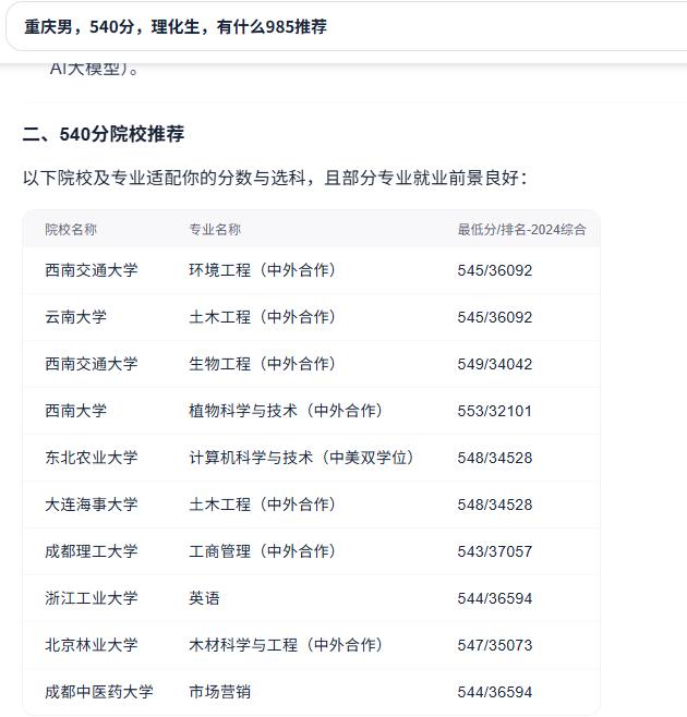 值得一提的是,夸克還升級了搜索體驗,提升到了AI深度搜索。在對話框裏輸入相應的問題就可以得到智能回答。例如搜索“540分有什麼985推薦”,下面就會跳出來智能回答。讓人意外的是,夸克沒有根據提問預設篩選一些985高校,而是自動匹配了540分數段對應的院校推薦。