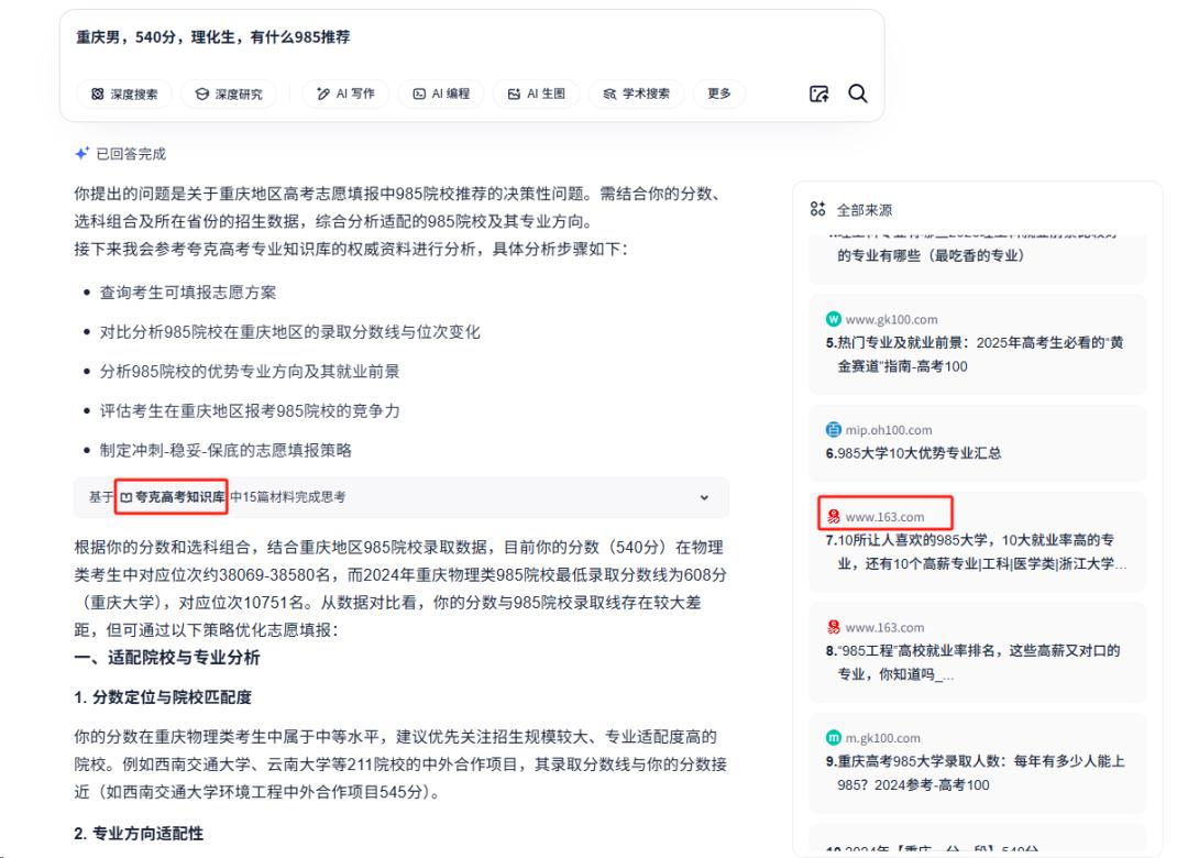根據“極點商業”搜索來源顯示,夸克給出的答案都源於“夸克高考知識庫”中,也就是夸克宣稱的,夸克的信息服務覆蓋2900多所高校、1600個專業及100多個主要城市就業數據。所有數據和信息都是來自官方考試院、官方高校、教育部、行業專家共建等的權威渠道,是可靠的信源。