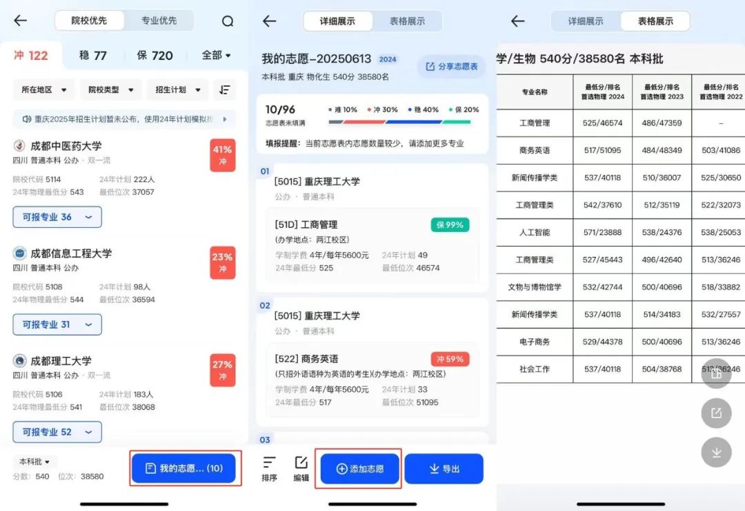 填好之後,就可以看到相應成績檔位的志願預估填報了。按照“極點商業”輸入的“540分重慶考生,物化生”條件,可以看到下面的志願填報推薦分為“衝”“穩”“保”三個檔次的學校。