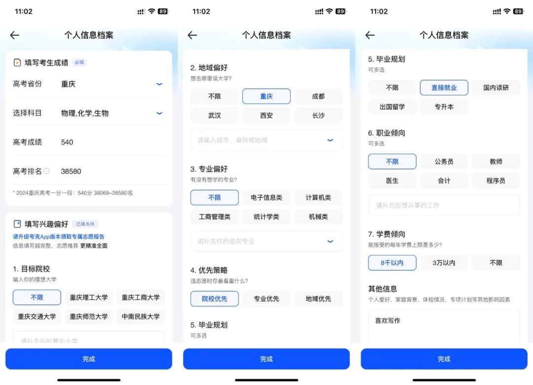 點擊首頁預估成績按鈕後,會跳出來信息填報,填好分數和科目之後,還需要填地域偏好、專業偏好、職業傾向等個人檔案。