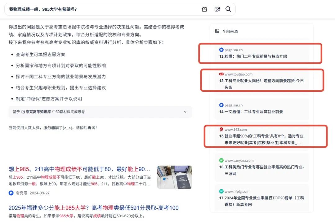 值得一提的是,搜索框問題明明是“985大學有希望嗎?”可夸克搜索的給出的網頁結果,卻是“熱門工科專業有哪些?”未免有些牛頭不對馬嘴。