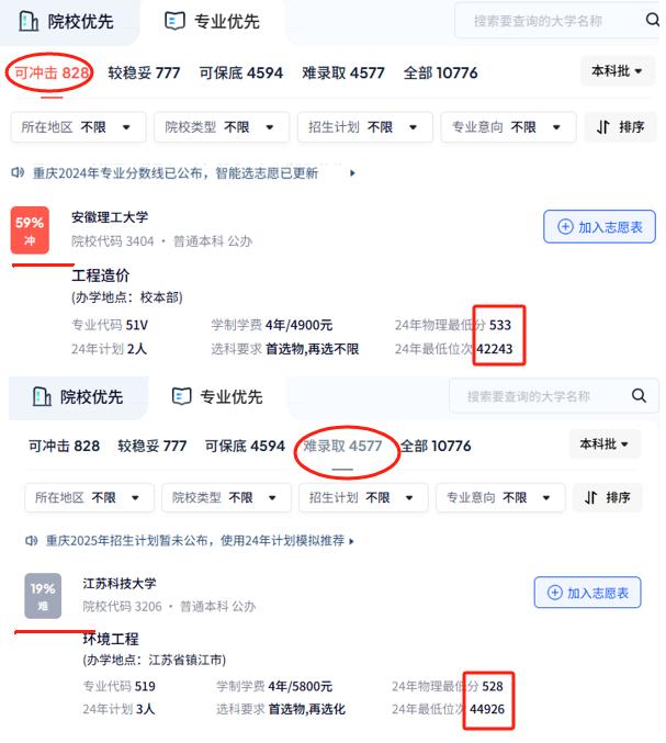 令人費解的是,對於540分段而言,528分居然比533分更“難”錄取。看下圖的示例,分數為533,位次42243的安徽理工大學,信息顯示錄取概率為59%,可以“衝”。