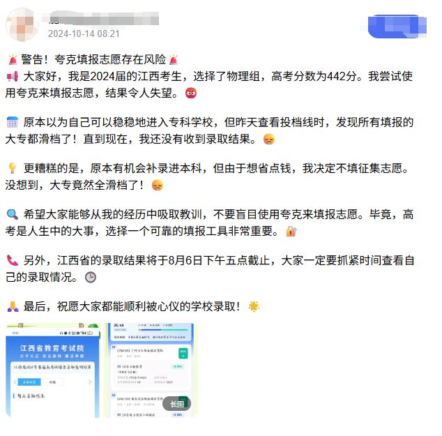 2024年被影響的還不止上面一位,還有用户在社交平台上曝出,自己是2024年的江西考生,物理組高考442分,他嘗試用夸克來填報志願,結果所有學校都滑檔了。