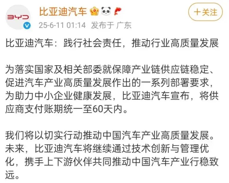 6月10日起,#比亞迪、#吉利、#長城 等多家車企集體宣佈,承諾“支付賬期不超過60天”。