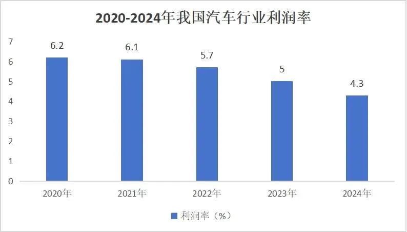 中國汽車流通協會報告顯示,2024年汽車行業利潤率僅為4.3%,低於整個下游工業利潤率及2023年的水平。