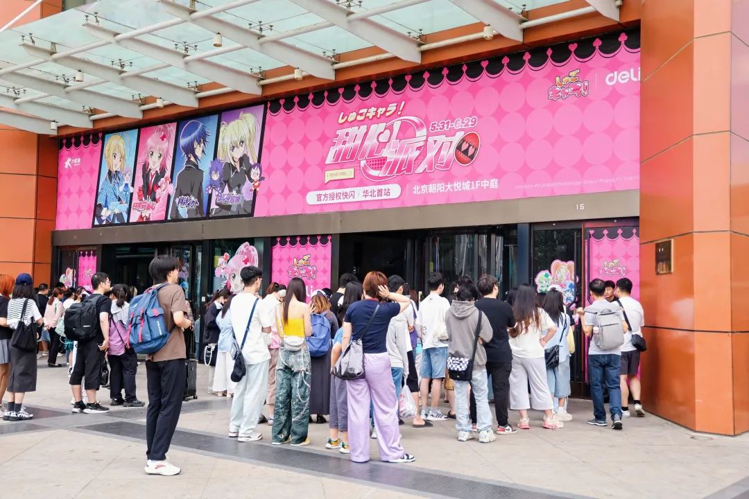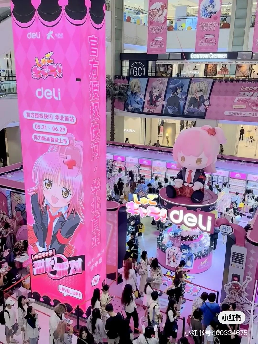 我們觀察到,繼去年開始不斷推出聯名產品後,得力在今年5月底,分別於北京和上海的核心商區開出了和守護甜心聯名的線下快閃店(沒錯就是你知道的那個動漫IP)。在人流攢動的靜安大悦城中庭,遠遠就能看到快閃店3米高的亞夢氣模。走進快閃店內部,聯名IP的主題元素佈滿了整個空間,放眼掃過去,和IP相關的產品至少在幾十種以上,不少貨架已經售空,許多消費者拿着購買的商品在巨型的主題背景板打卡留念。這種沉浸的快閃體驗和超高的人氣顛覆了過去我們對於文具品牌做二次元IP聯名的印象。