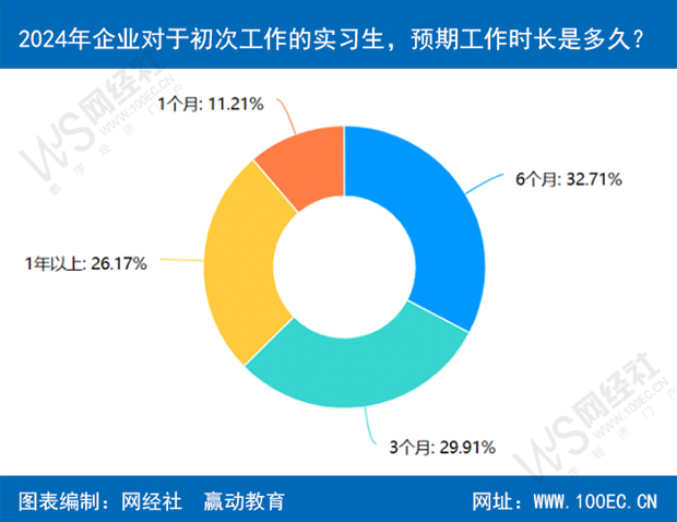 報告顯示,企業對於初次工作的實習生,預期工作時長佔比最大的是6個月,其次是3個月。初次工作的實習生或應屆生,最受詬病的就是過高的離職率。這和大學生缺乏成熟的職業探索過程有關,對自己對崗位缺乏客觀的認知,辭職就是個體和職場不斷磨合的體現,只是首次僱傭應屆生的企業要承擔更多的培訓成本。