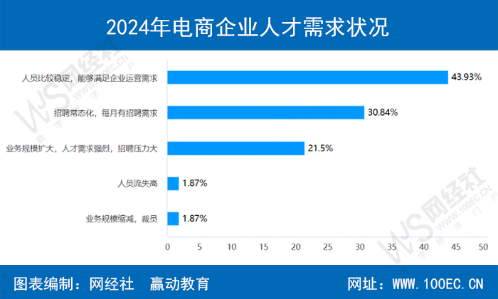調查數據顯示,電子商務企業人才需求整體狀況中,人員穩定以及招聘常態化的狀態,佔比達74.77%。業務規模擴大,人才需求旺盛的企業佔比21.5%,比2023年的19%繼續增長。電子商務人才需求狀況比例最高的為人員穩定和招聘常態化,業務規模擴大的比例比較2023年增長13%,説明電子商務行業已經處於穩定發展階段,有更多的企業開始新的擴展。