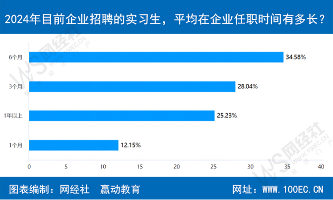 在調查數據中,實習生的留存期,佔比最大的是6個月,其次是3個月,一年以上的僅佔25.23%。當前大學生就業難的困局,和這個數據有很大關係。聘用實習生或應屆生的企業,把一個職場新人培養成能夠承擔崗位任務的合格員工,需要大量的時間和成本。但面對3-6個月的留存期,企業是否願意支付這個培訓成本?