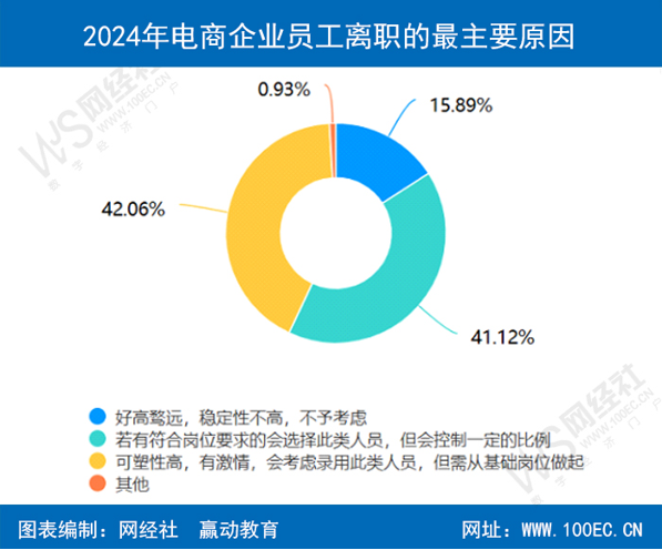 合計83.18%的企業對招錄大學畢業生或實習生持積極態度。持負面看法的企業僅有15.89%,相比2023年19%的數據有較大下降。在大學生普遍就業困難的當下,電商企業對招募應屆大學生普遍持積極態度。這也和電子商務的產業特徵有關,**電商是植根互聯網的數字經濟,要求員工熟悉互聯網流量文化,**這是年輕大學生的優勢。