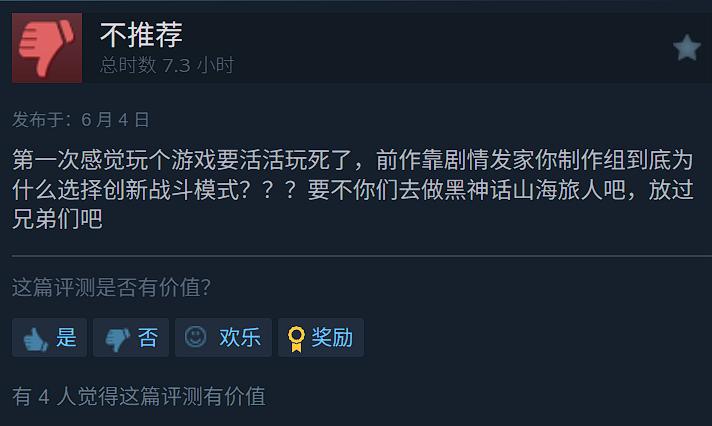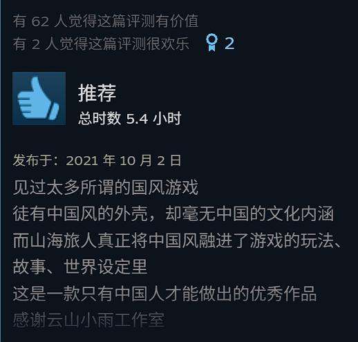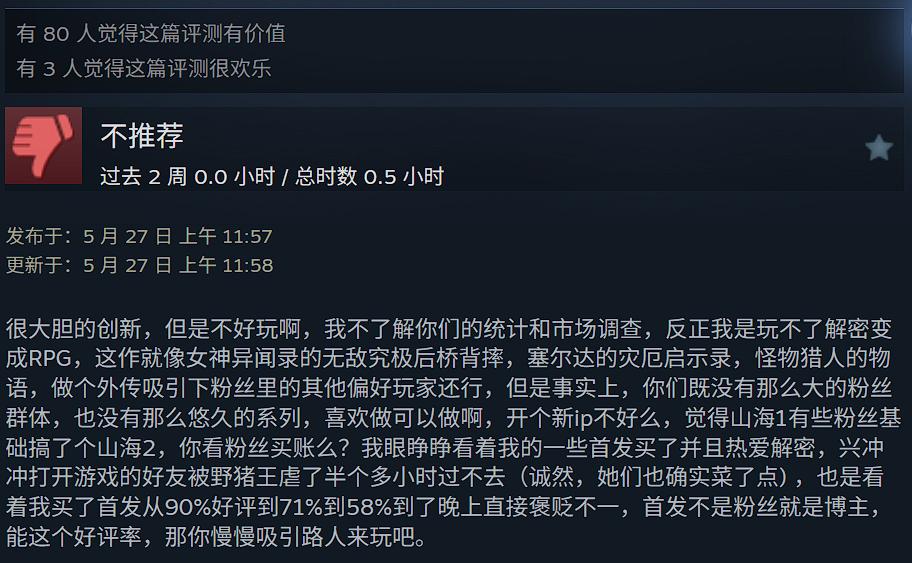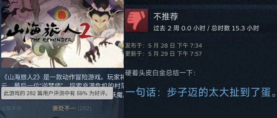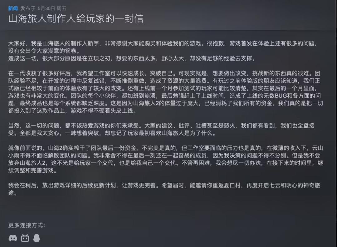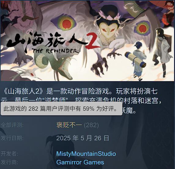 《山海旅人2》的Steam頁面中,製作人魏新宇在給玩家的一封信中寫道。此時距離遊戲發售僅僅過去四天,好評率已經驟降至不足6成的“褒貶不一”。