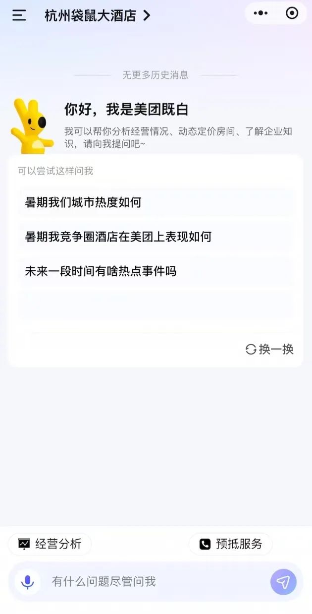 「美團既白」整合了本地活動即時數據,比如演唱會、考試、節假日流量等,以及歷史預訂曲線,生成動態經營建議。在客户預抵達服務上,能通過 AI 自動識別客人歷史偏好(如房型、餐飲忌口),結合到店當日天氣、交通擁堵信息來響應用户的個性化訴求,幫助酒店提高深度服務能力。