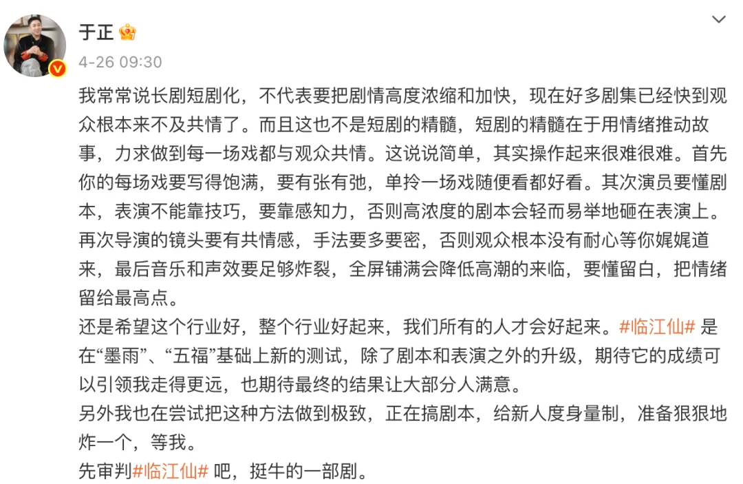 此前,在該劇正式播出之前,作為《臨江仙》出品方之一的於正(歡娛影視)曾在微博發文,談及對長劇短劇化的看法,他認為:長劇短劇化不代表要把劇情高度濃縮和加快,而是用情緒推動故事,力求做到每一場戲都與觀眾共情。《臨江仙》也是嘗試這一方向的作品。