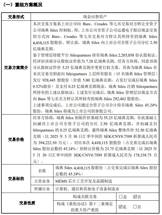 近日,賽微電子宣佈,擬向Bure、Creades 等七名交易方轉讓公司所持有的瑞典 Silex Microsystems AB 45.24%股份,交易價格為 23.75 億瑞典克朗,約合人民幣 17.83 億元。