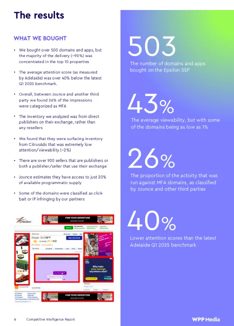 根據《廣告時代》的報道,6月9日,全球最大廣告集團之一WPP通過旗下WPP Media發佈了一份“情報報告”,長達8頁。報告裏WPP公開指出競爭對手陽獅集團旗下的 Epsilon SSP,稱其向程序化廣告生態系統注入“大量低質量、僅為廣告而建(MFA,Made‑for‑Advertising)”庫存。