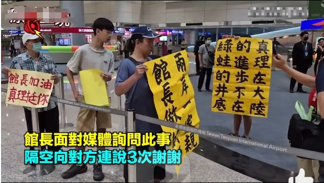 館長無奈的嘆氣,對中天記者説:我今天敢來,就知道一定會遇到這種人,逼你表態,你趕快講,這個我很習慣,我無所謂,這一段,三立(新聞)有題材了。